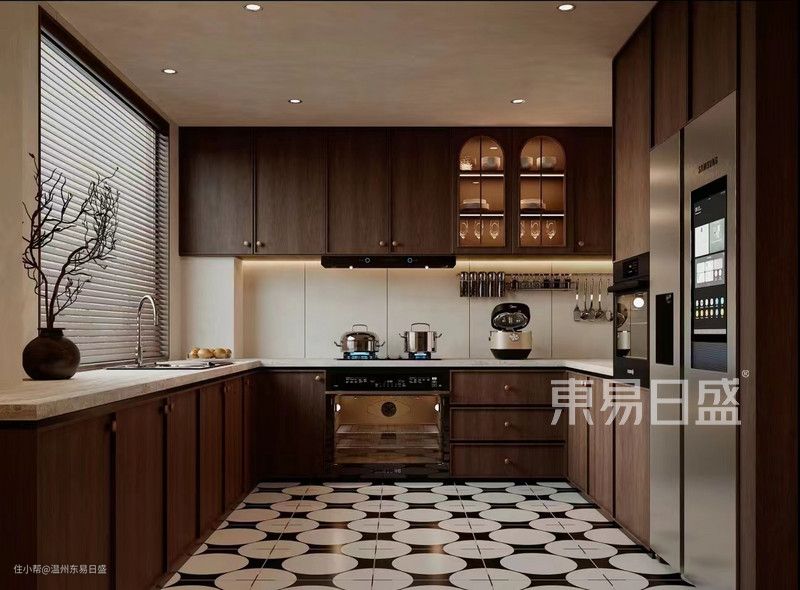其中复古棕橱柜和棋盘黑白砖是法式复古厨房的经典选择,带来一种永恒经典的美感,在其中穿插烤箱让两种时代碰撞复古中彰显出几分潮流。L型厨房格局可以提供更多收纳空间,经典的动线组合让各种操作更加清晰明朗。