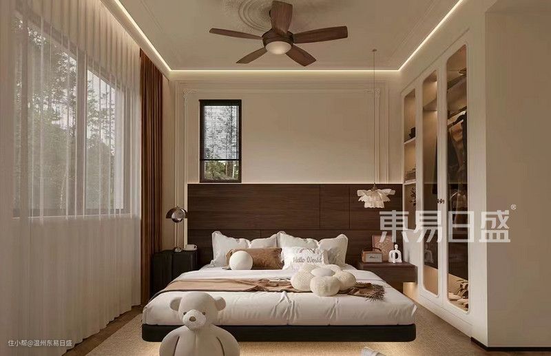 嵌入式衣柜增加美观性还承担收纳空间,房间同样采用石膏线和雕花设计与整体风格相符,在尊重传统的基础上,法式复古设计也强调个性化的表达,于是在儿童房采用了原木色风扇外形的吊灯,没有跳脱出整体风格的同时还增添几分童趣。
