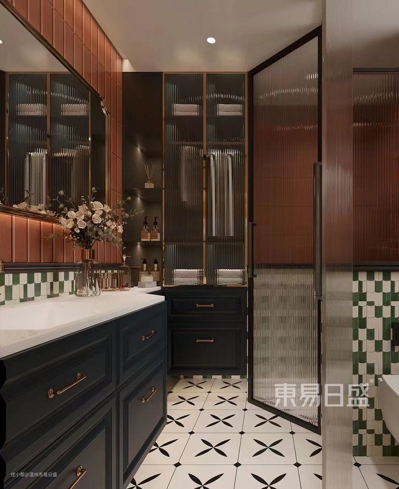 藏蓝色浴室柜和红砖搭配凸显浓厚的复古风格,使用大量玻璃材质增强空间感,视觉上更显宽敞舒适,采用隐藏式灯槽见光不见灯,更显氛围。分割淋浴区域,干湿分离生活更加舒适。