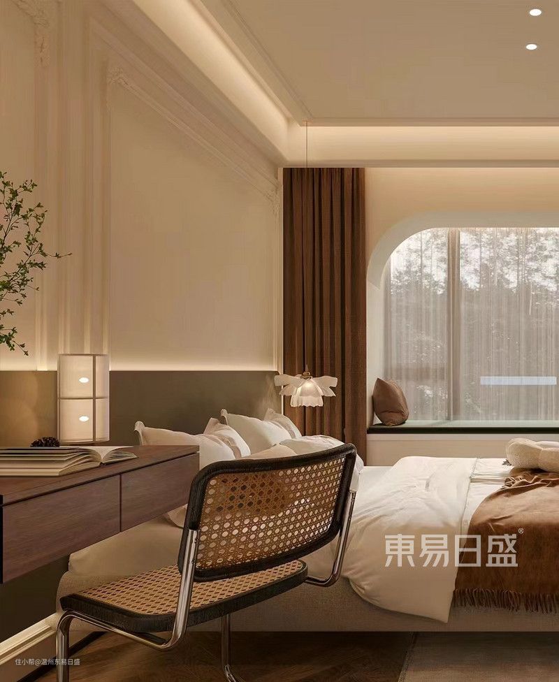 采用无主灯设计,用筒灯和灯带的组合来保证光源,飘窗区域使用软垫和抱枕打造出休闲区,闲暇时在此读书观景,营造出一个既优雅又温馨的居住空间。
