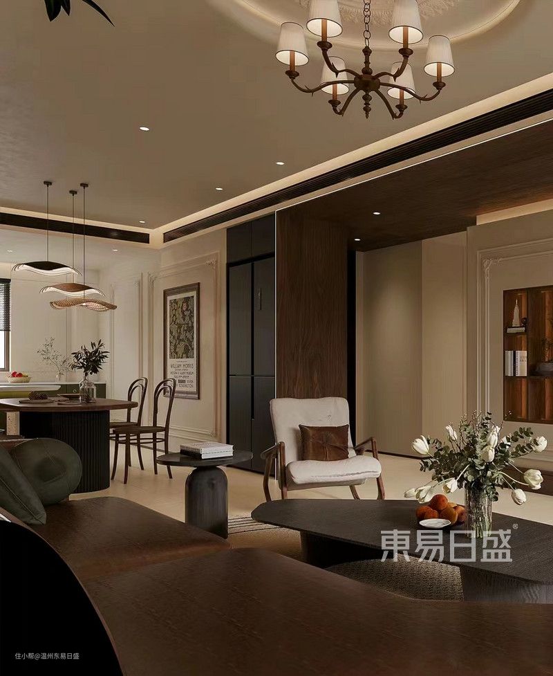 客厅以棕色为主基调,透露出典雅和神秘。在细节方面,采用了法式经典的元素,如雕花、石膏线条等元素,这些精致的装饰不仅体现了工艺的精细,也增强了空间的层次感和艺术性。在此基础上融入现代的设计理念和功能需求,如现代化的家具和便捷的布局,使复古风格与现代生活完美融合。