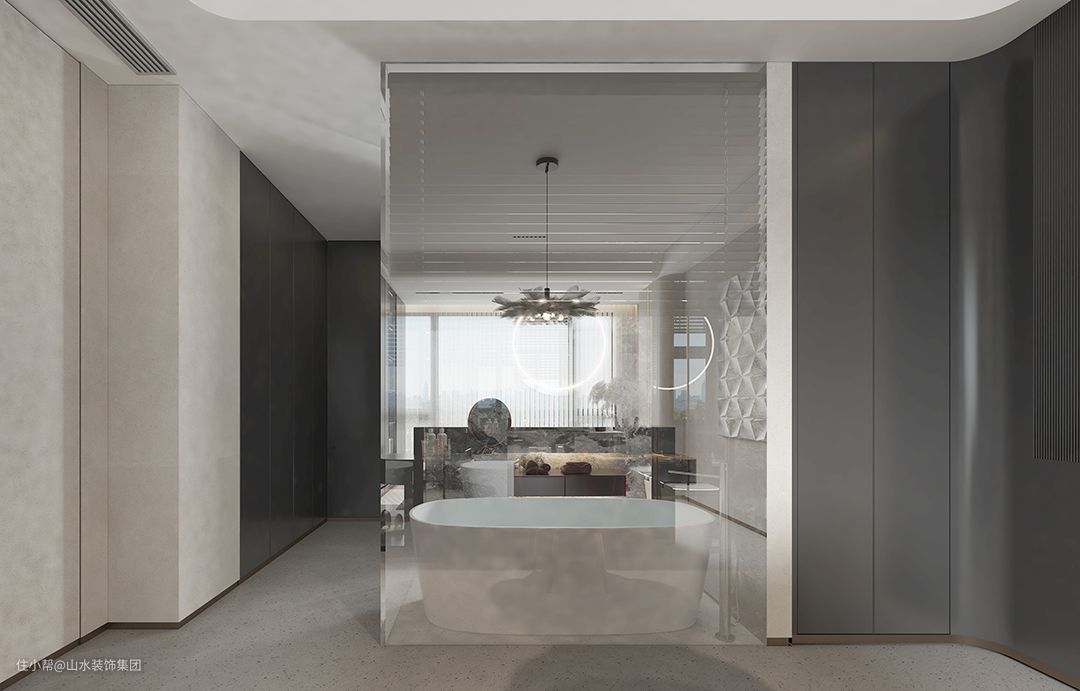 利用玻璃做隔断,将主卫与睡眠区做了区分,但又不影响室内采光。超白玻的光感非常强,颜值还高,映衬着主卫内的大理石墙面,将质感拉到最大。利用淋浴房实现的干湿分离,也为生活提供了方便。