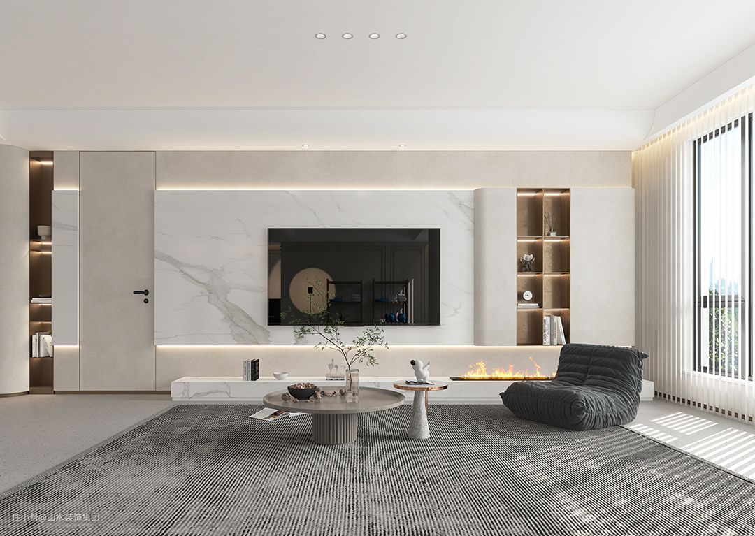 客厅与南阳台合为一体,白色的梦幻帘让进入室内的阳光变得柔和了许多,并带来丰富多变的光影,梦幻且舒适。微水泥装饰的墙面拥有极丰富的肌理感,独一无二的质感无形中展现着居者对品质的追求,极简却不忽视质感。