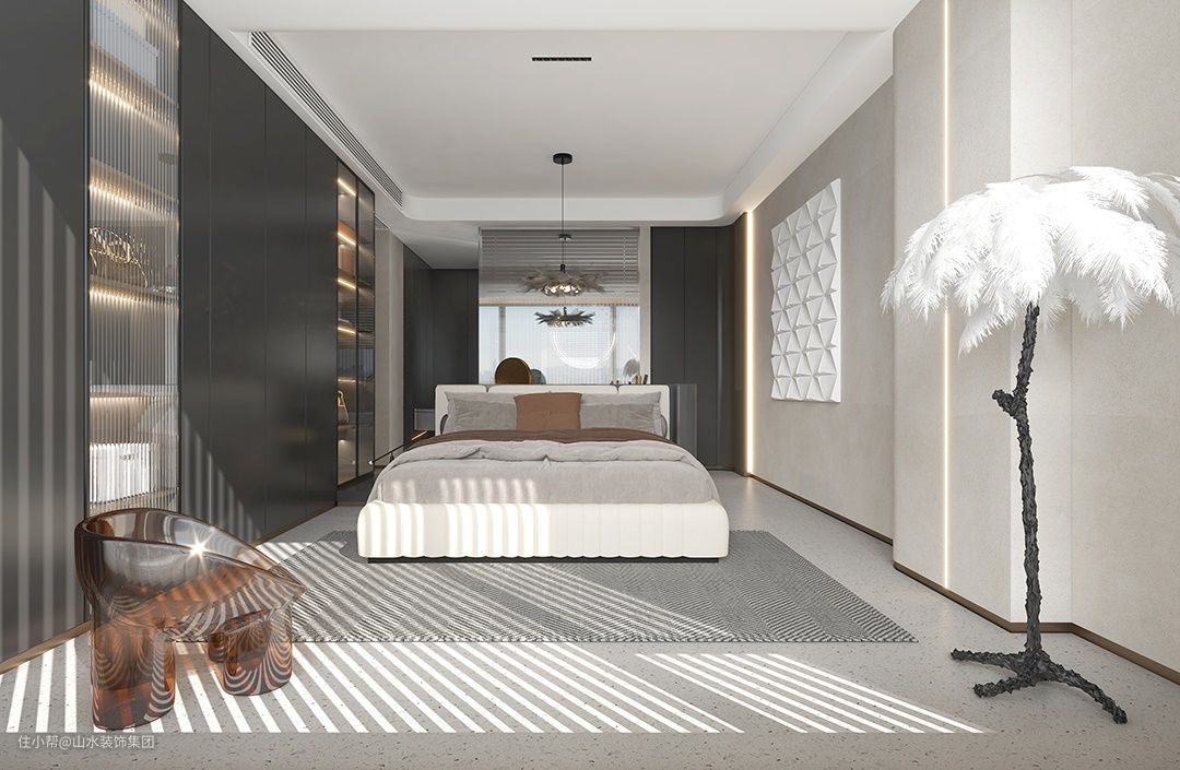 床头后方,是悬浮式设计的梳妆台,深灰色的台面点缀着金属线条,造型极简,却不失质感与时尚格调,看起来也更加高级大气。衣柜沿墙做顶天立地式造型,局部点缀着玻璃柜,将装饰与收纳融为一体,又美又能装。
