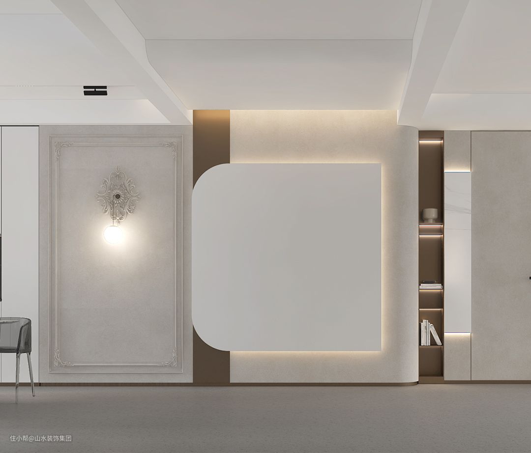 客餐厅之间的过道采用的是开放式布局,并沿墙定制了局部内嵌置物架,方便收纳常看的书籍或者摆件等,既是装饰,也是储物区。背景墙的部分做了局部悬浮式设计,微水泥与灯带的结合,层次分明,质感尽显。