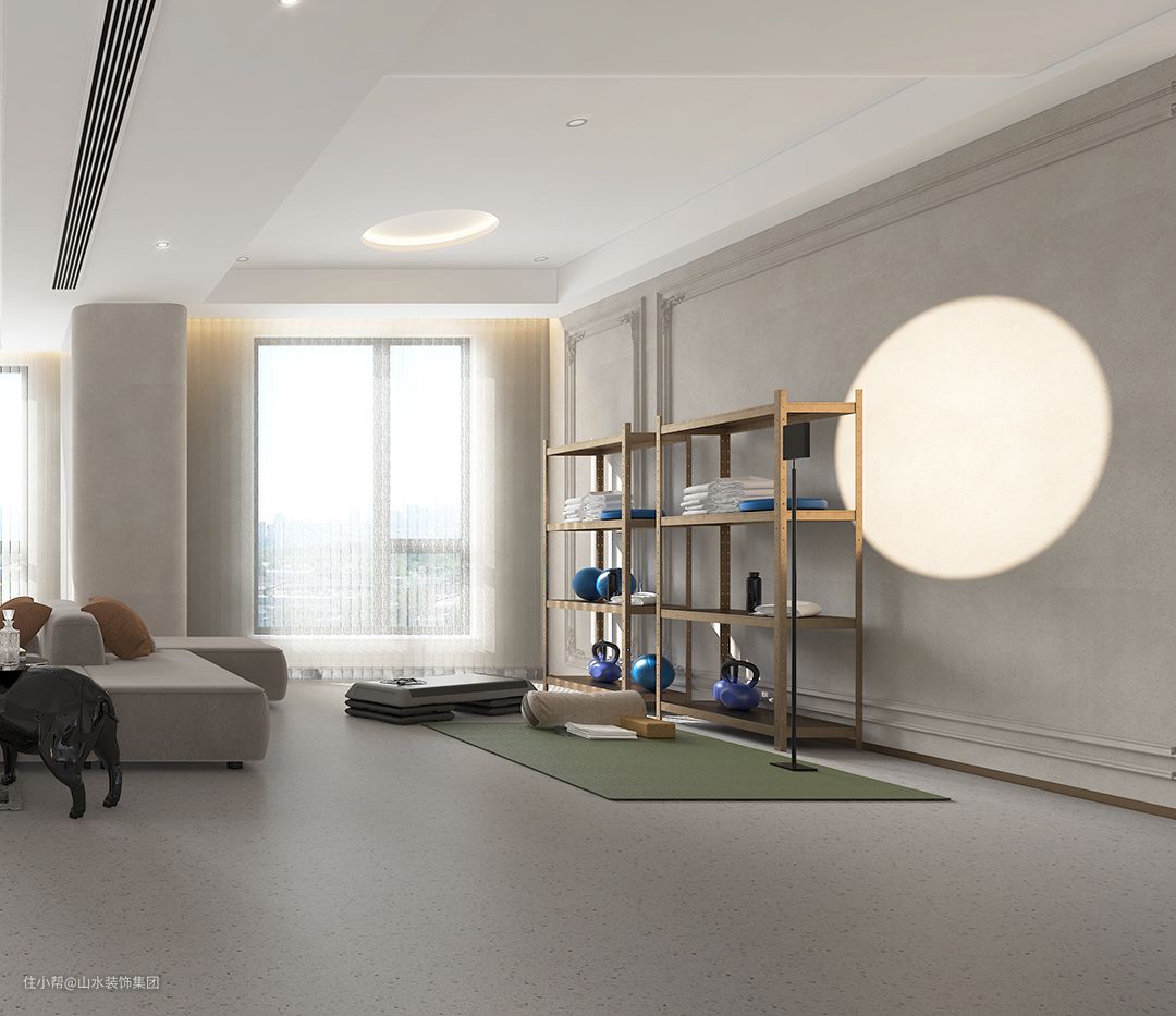以沙发作为分割介质,将原本的次卧改成开放式布局,打造成女主人的瑜伽区。没有设置过多家具和装饰,利用木架收纳各种瑜伽用品,开放式设计取用方便,强化空间的功能属性。