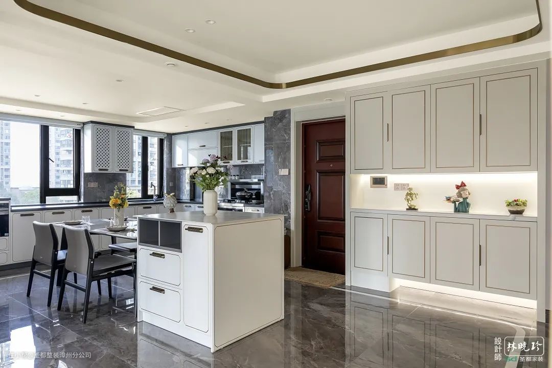 在厨房新增一个独立岛台,既可以作为料理的台面,又可以作为临时就餐区。由于岛台是围合式布局,会更有其乐融融的用餐温馨感。