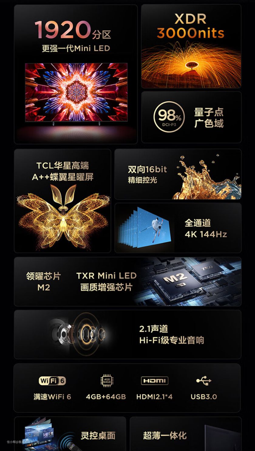 Q10H是TCL2023年推出的次旗舰系列(定位来说并不是去年Q10G的后续型号),也是线上的旗舰型号,整体的硬件堆料和配置可以说十分炸裂。我们来看看这台顶级Mini LED 液晶的奢华配置吧,3000nit峰值亮度+1920个分区控光+98% DCI-P3广色域屏幕+领曜芯片M2+A++广角超显屏,可以说堆料已经十分极致。采用了全新升级后的芯片,全功能HDMI2.1接口提升到2组。硬件采用A73四核1.4GHz芯片搭配4G+64G的存储组合,可以很好满足日常需要和战未来的需要。支持杜比视界和杜比全景声,配合2.1专业音响系统,居家也可以实现极佳的音画表现。新升级的灵控桌面和遥控器,可以实现方便快捷的操作和各类自定义功能,使用体验上会有更好表现。总的来说TCL Q10H这次是将堆料做到了极致,同时搭配不错的调教和优化,整个使用体验确实给力。想要一台高端电视,可以重点关注下Q10H系列。
