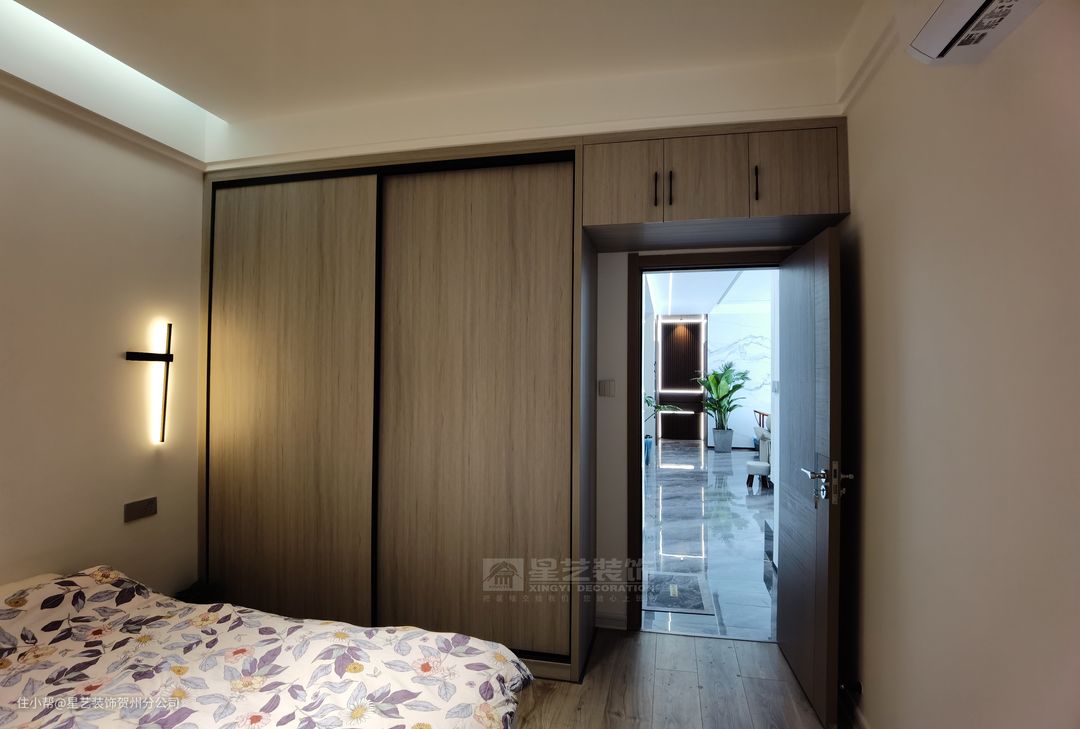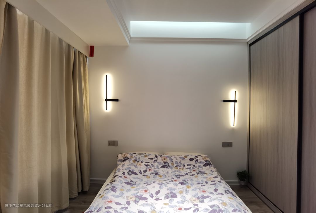 次卧也采用了无主灯设计,在床头上方做了一条反光灯槽,营造的氛围也是很舒适自然。
