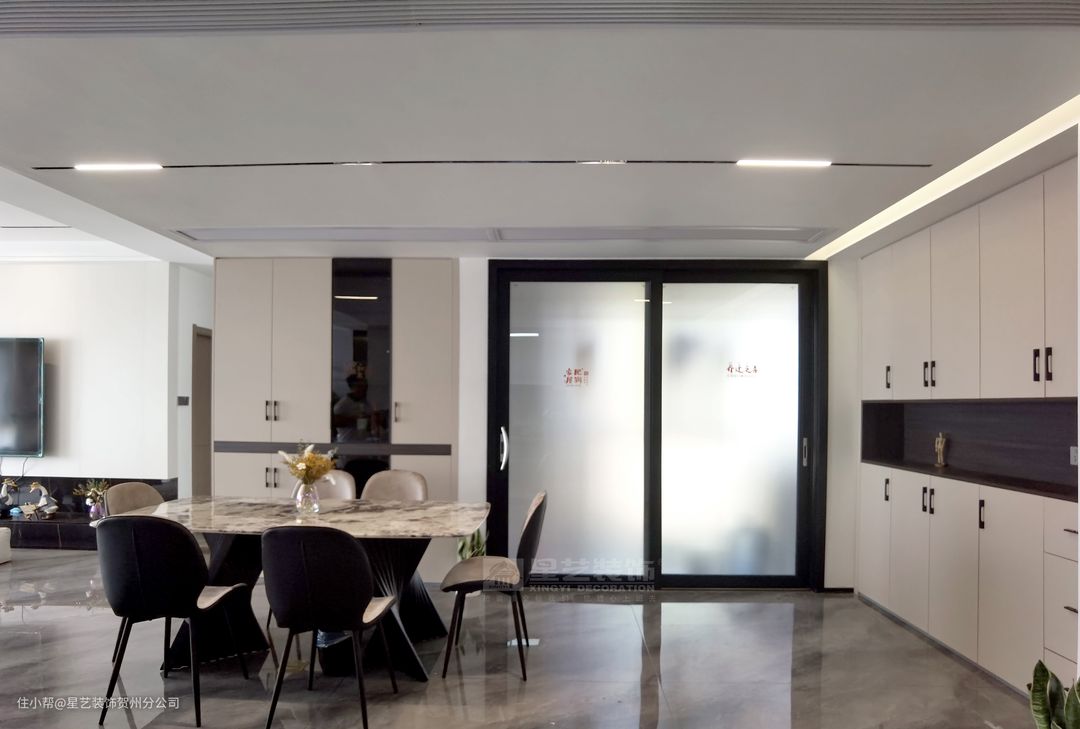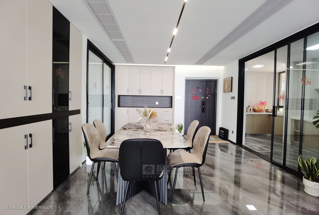 客厅望向餐厅,右侧的靠近厨房位置业主也做了一排的储物柜,放置一些茶具用品,图片