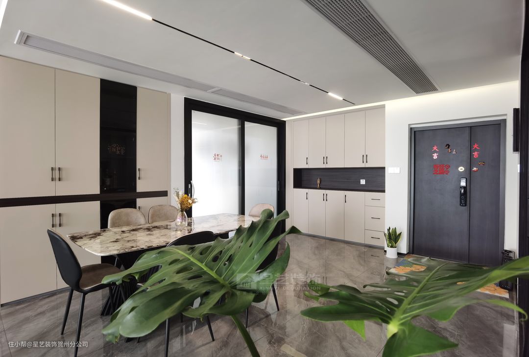 1、将餐厅放在最显眼的地方,合理规划过道,做回字形动线,过年亲戚上门拜年,两张桌子完全可以放下。