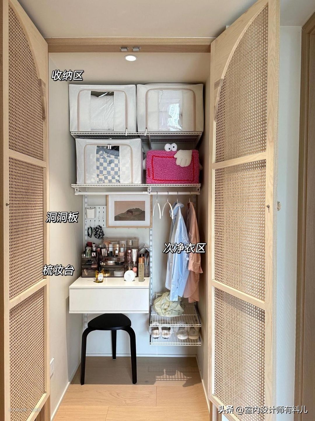 网友@一只兔子酱家的卧室面积很小,但也划出了一个小角落做成了衣帽间,金属衣柜搭配通风透气的藤编门,好看又实用。