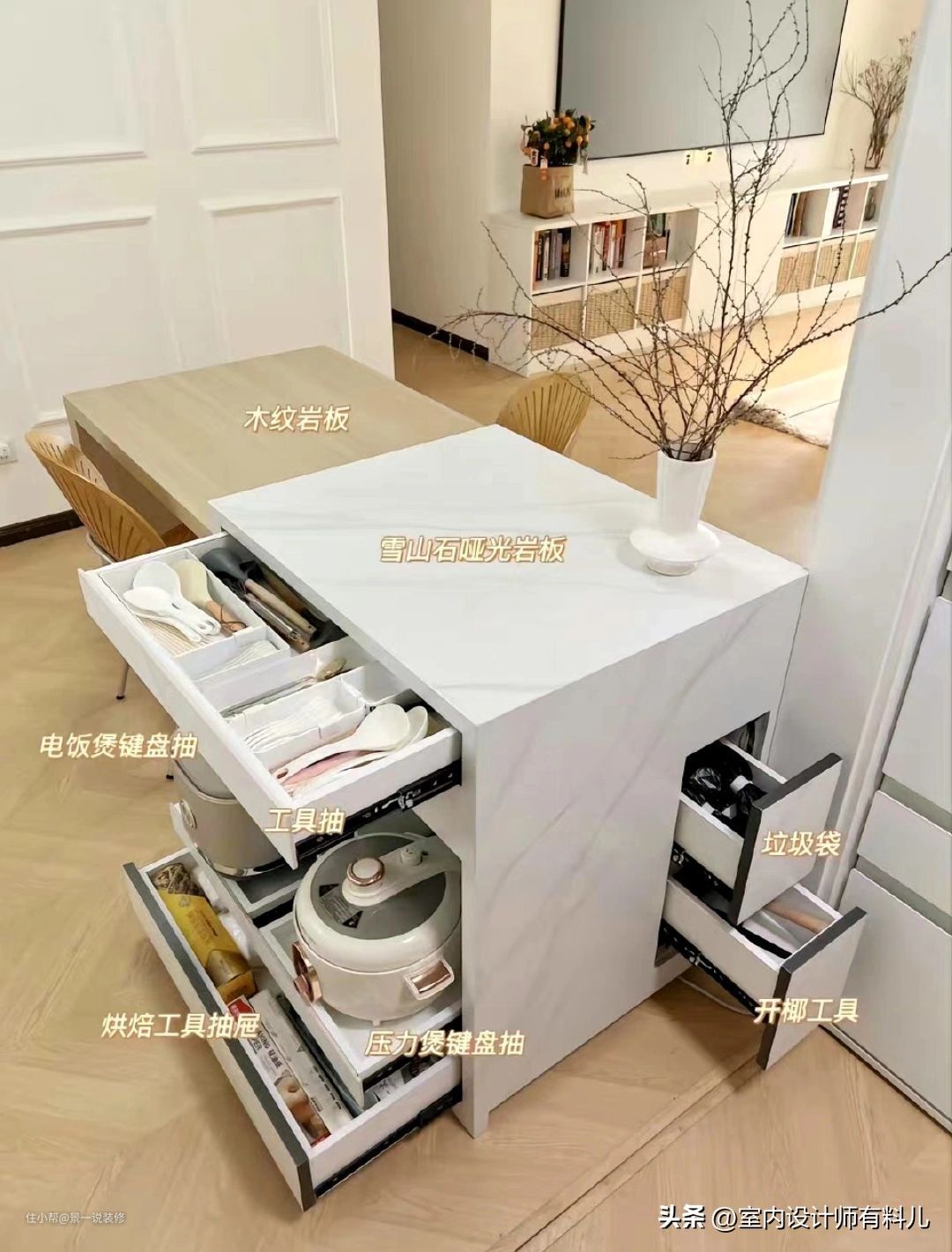 尤其是那些开放式厨房,一定要搭配一个岛台,不仅颜值高,而且收纳力强。