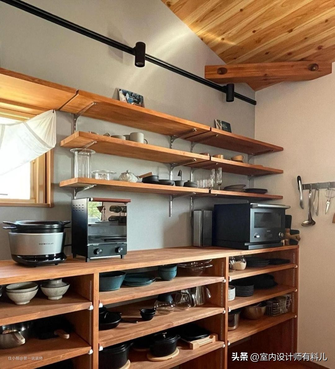 如下图中日式厨房这种置物隔板及开放架,不仅解决了厨房的整理问题,还成为了家中的展示空间。