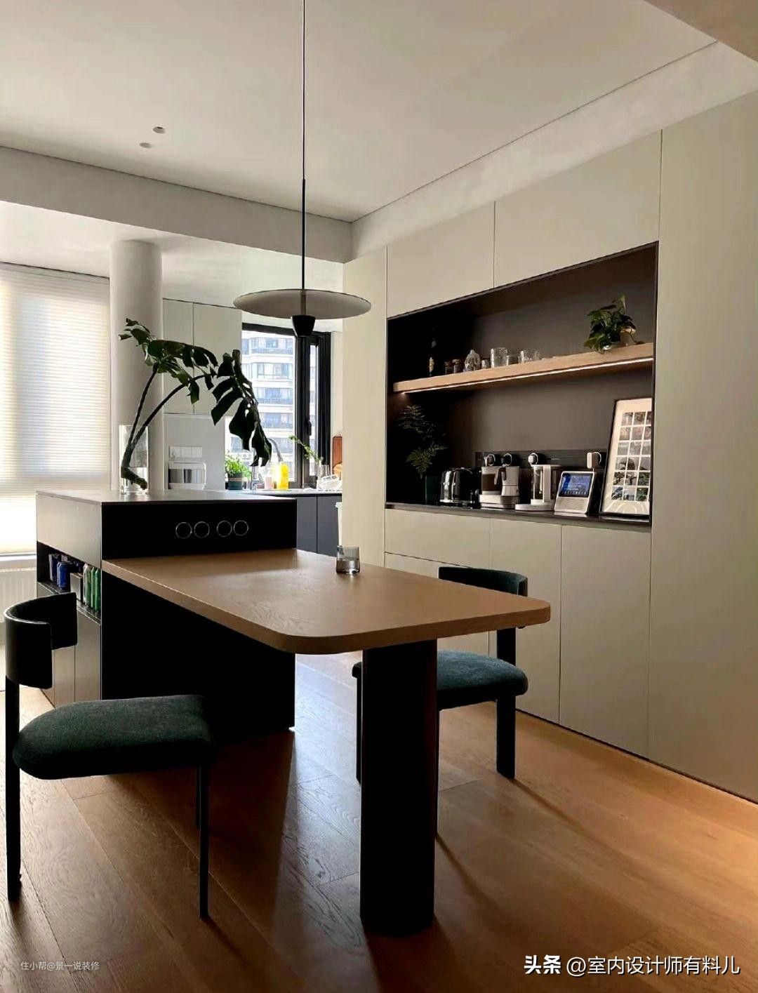 有氛围感,岛台相比于传统餐桌,更符合年轻人的审美,台面上摆放鲜花,在这里做做料理,喝喝酒都很不错。
