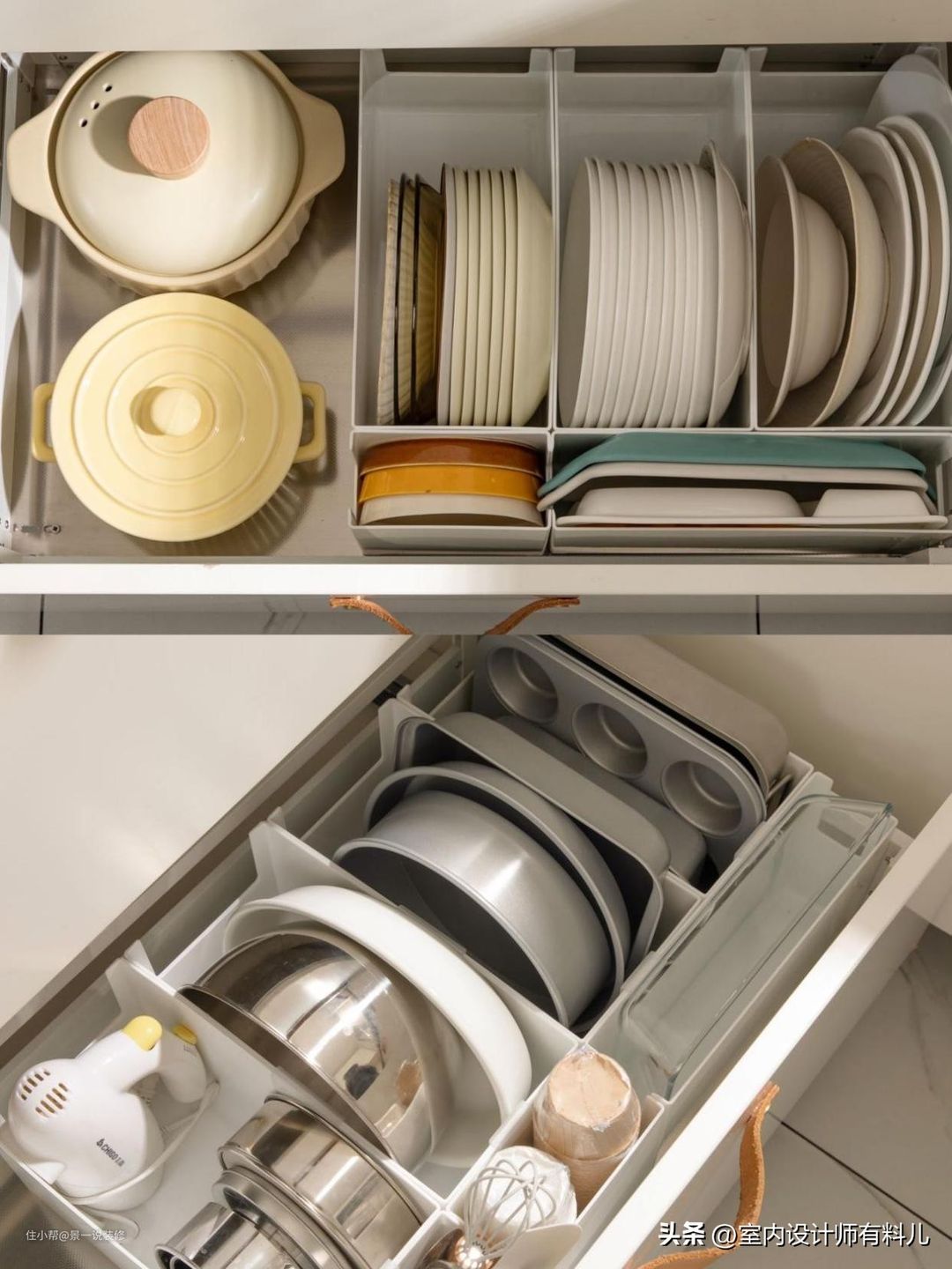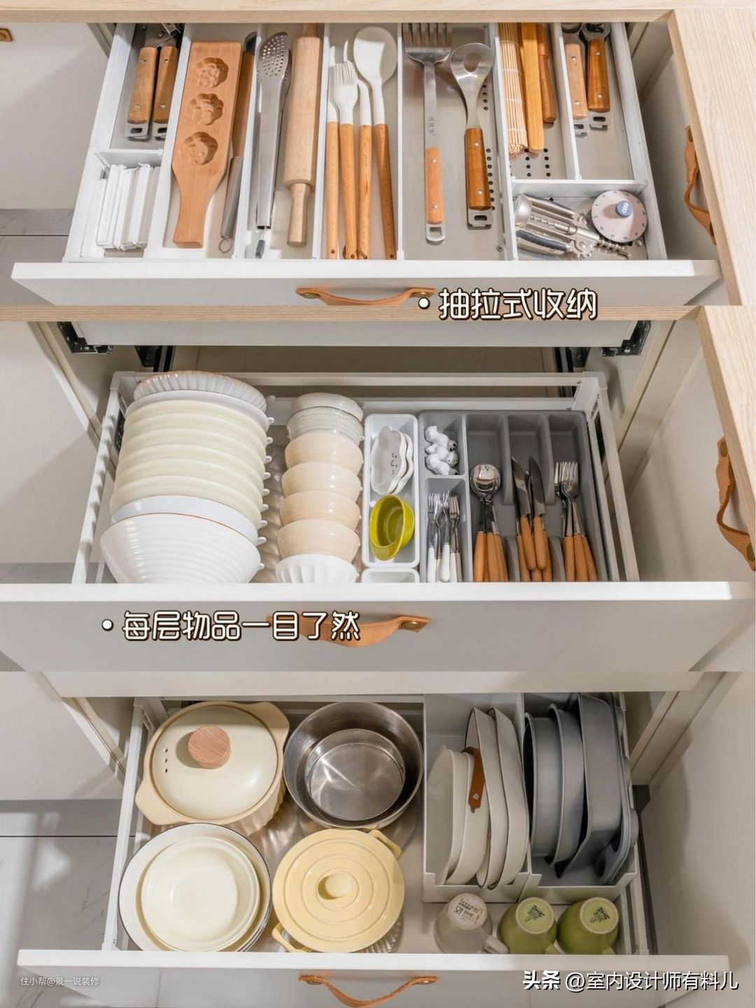 收纳强,定制大小不一的抽屉,用来放置各种各样大大小小的餐具电器。