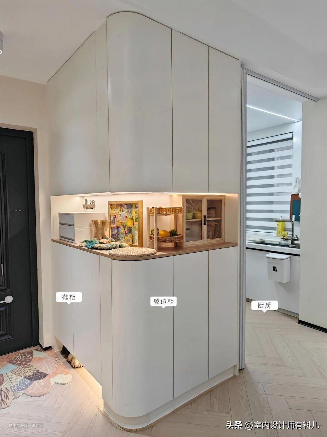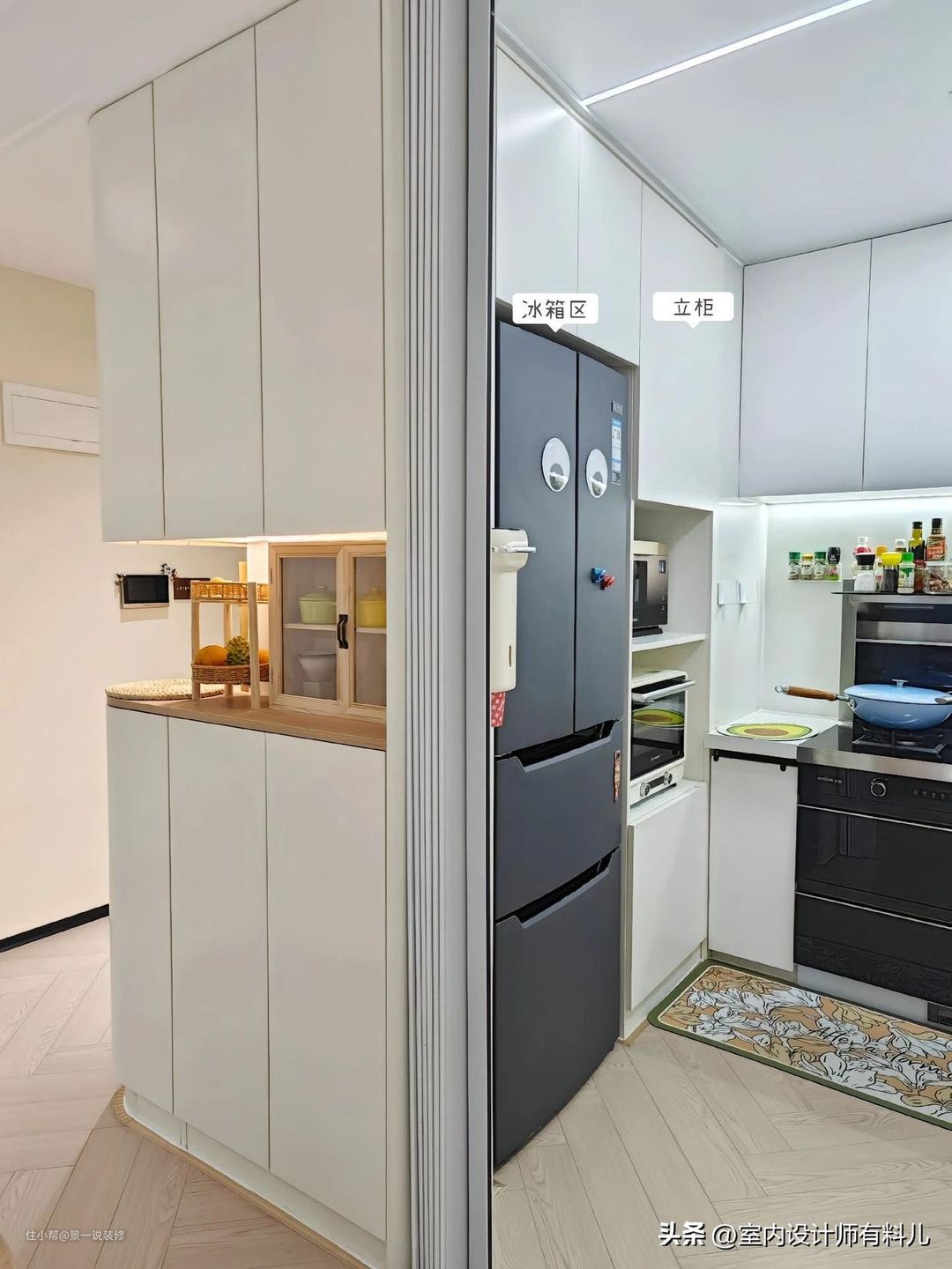 这个设计让第一、入户鞋柜可以收纳50双鞋子。第二、转角面是餐边柜,可以囤日常用品,零食和餐厅用的小物件。第三、鞋柜的背面是冰箱+立柜,还放了烤箱/微波炉等等,最大化利用了厨房空间。
