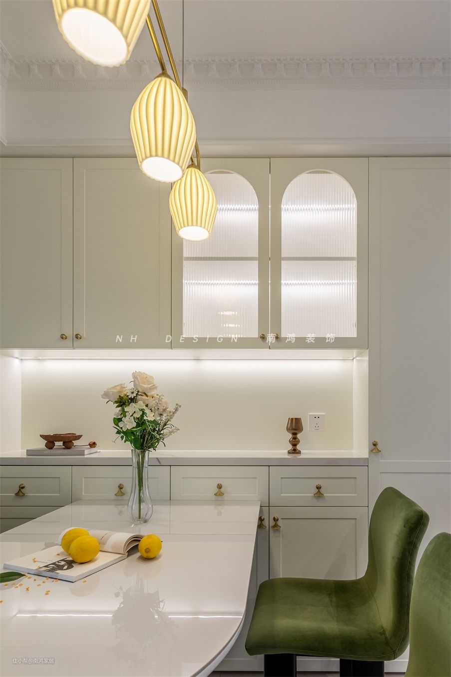 厨房与餐厅间的长虹玻璃隔断增添了餐厨区的精致度与神秘感,拱形柜门投出餐灯挥洒的暖光,营造出复古温馨的用餐氛围。