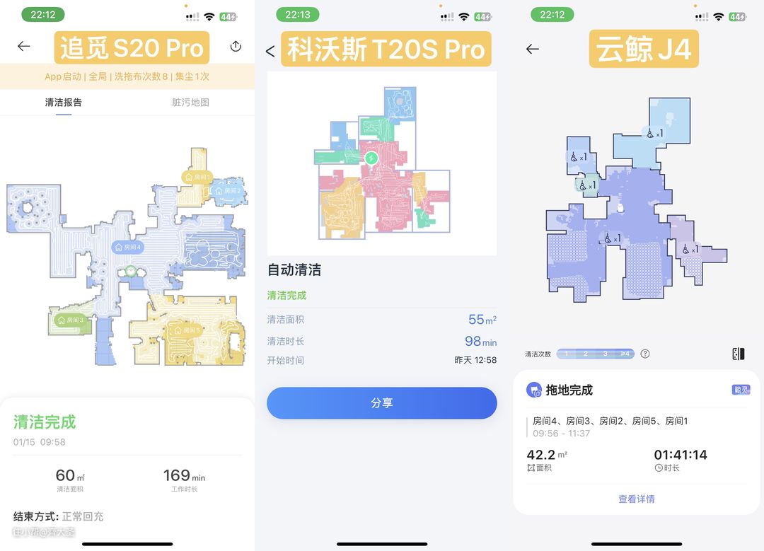 三款机型分别提供了2-4种清洁模式(追觅S20 PRO:2种、科沃斯T20S PRO:3种、云鲸J4:4种);