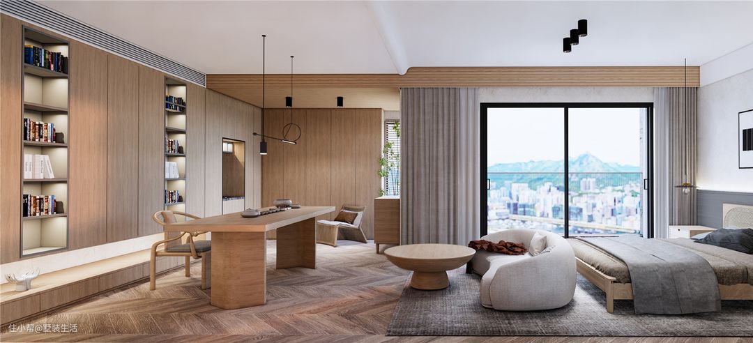 侘寂之美主场“不对称主义”,呈现一种不对称却包容的美,空间的布局卷月随意明满足着业主的功能需求,尽量保持布局中的“空”与极简,呈现侘寂风的随性之美。