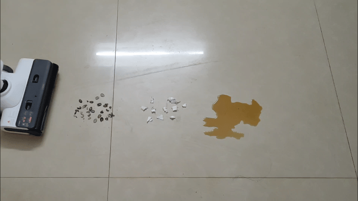 这款洗地机搭载了高转速电机马达,清洁力还是比较强悍的,瓜子壳、纸屑、咖啡液等干湿垃圾的清理效果如动图所示,基本上一遍就能清洁干净。