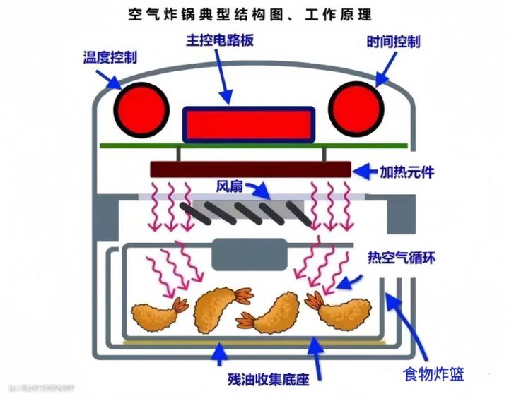 空气炸锅因其高效的烹饪性能而受到欢迎,能在无需使用油脂的情况下制作出类似油炸口感的美,符合现代人的饮食健康理念,又满足了人们的味蕾需求。在油炸过程中,温度可达150℃至300℃,油的沸点高于水,从而加速食物表面水分的蒸发,使食物变得干脆美味。 空气炸锅由风扇、加热元件和气旋加热室三部分组成。工作时,加热元件将炸锅内的空气加热至高温,风扇则产生气流,通过加热室的特定路径加速气流旋转,从而加热食物并蒸发水分,达到类似油炸的烹饪效果。