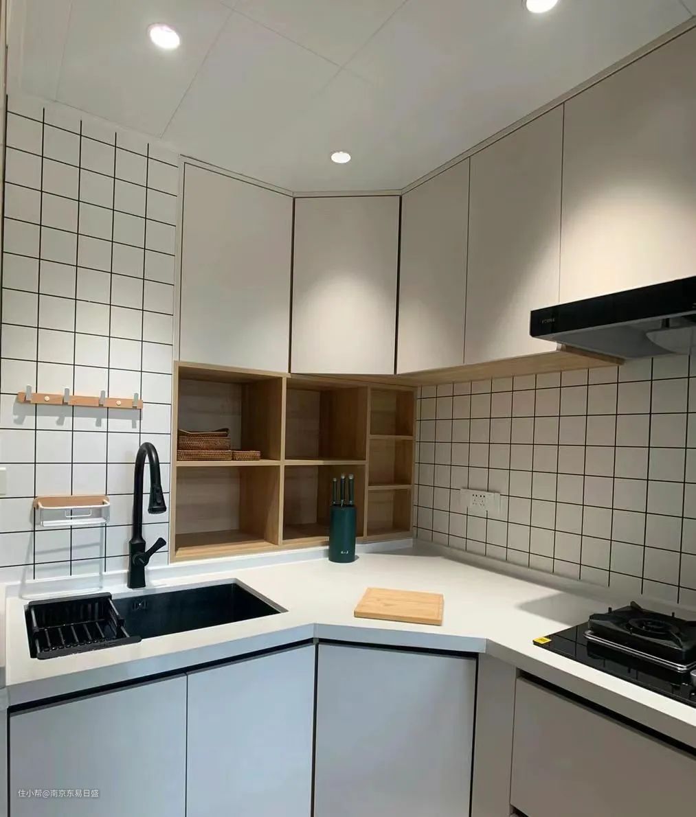 直接将一个方向的橱柜做短一节,另一个方向将交界处的柜体镂空,上方的台面依旧正常连接。但每次拿取物品需要蹲下身,且此设计会有油污影响。
