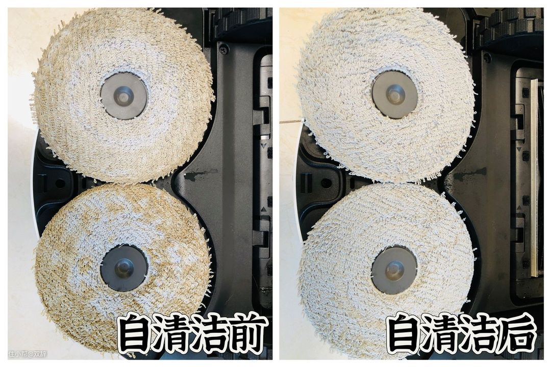热水自清洁和自动烘干程序结束后,来看看拖布和滚刷清洁前后的对比情况。
