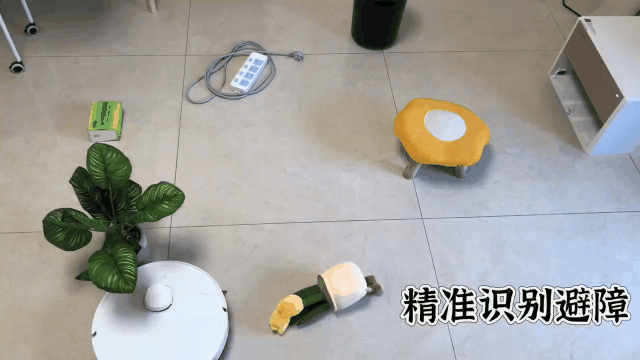 这里我在家里划出一个区域,并放置了6样常见的物品,像垃圾桶、拖鞋、电源线、绿植等,看看它避障能力如何。