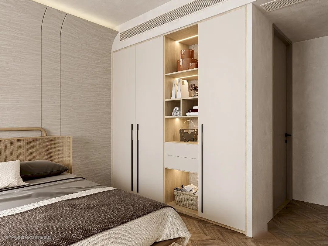 如果你家使用的是平开式柜门,那么衣柜到床的距离至少80-120cm,方便开关门的顺畅。