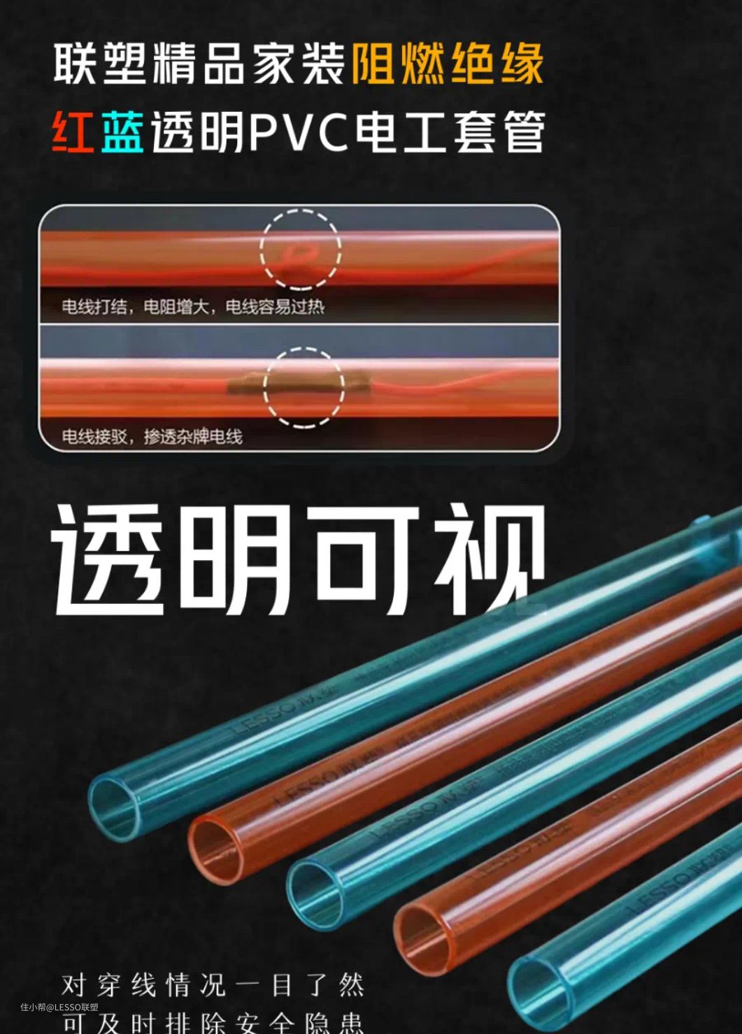 联塑精品家装阻燃绝缘红蓝透明PVC电工套管,采用新型PVC材料,具备绝缘性能好、抗冲击能力好、防火性能好、防潮、耐酸碱、易弯曲等一系列优点。红蓝透明设计,区分强弱电,易识别,好维护,哪里出问题一眼就能看清,安全可靠又放心。