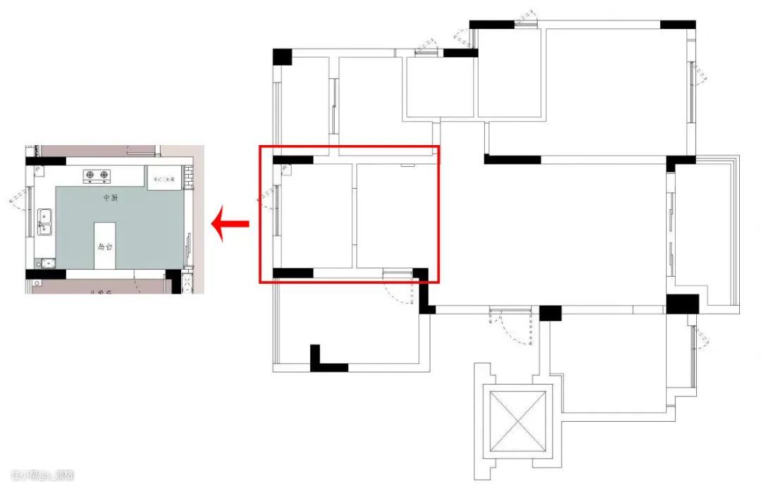 通过将卫生间和北阳台的空间扩进餐厅,实现中岛餐厅的设计,成功地扩大了原始户型中相对较小的厨房空间。