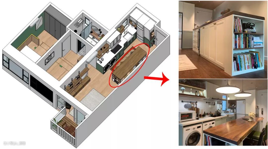 中岛不仅可以作为厨房功能的一部分,还可以充当隔断,起到划分空间的功能。