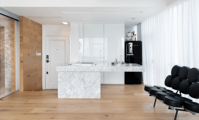 中岛与厨房和餐厅融为一体,完美地保持了整个空间的统一性,同时巧妙地划分了这两个功能区域。