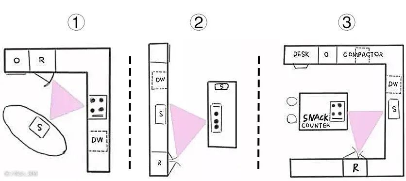 岛台作为厨房操作台的一部分,动线设计上的流畅性至关重要,遵循“冰箱取菜☞水槽洗菜☞台面备菜☞灶台烹饪☞台面装盘”这条线,如下图: