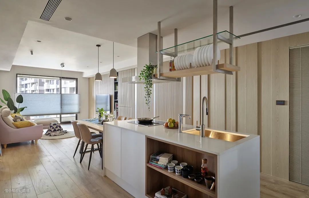 ↓↓↓以下↓↓↓这个130㎡的家里,我们将厨房与餐厅合并,用岛台餐桌的形式盘活餐厨,将中西厨贯穿起来: