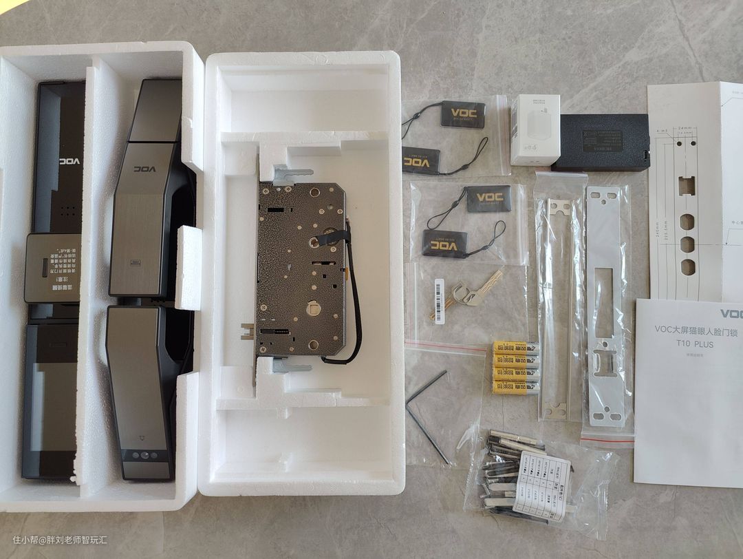 VOC智能锁的配件还是非常丰富的:锁体(全自动内置电机锁体、C级锁芯)、内外门锁面板、4个5号电池和锂电池包、机械钥匙、NFC钥匙、说明书、网关等。