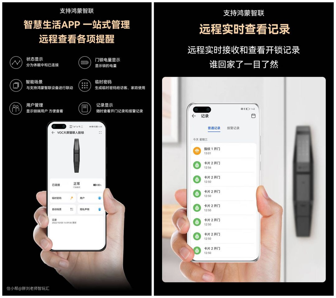 而且在手机APP还有状态显示、门锁电量显示、智能设备联动情况、访客临时密码以及用户管理等,另外还有开锁记录以及各种报警记录,真正做到留痕的效果,非常棒!