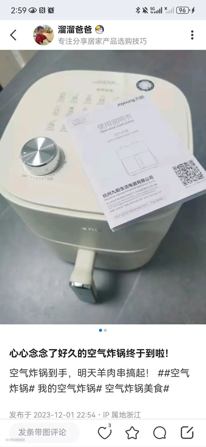 下面是我23年12月1号,空气炸锅刚收到快递的时候发的想法,到现在两个来月吧,用它做过羊肉串,做过蛋挞,炸过排骨、炸过N多次花生米。