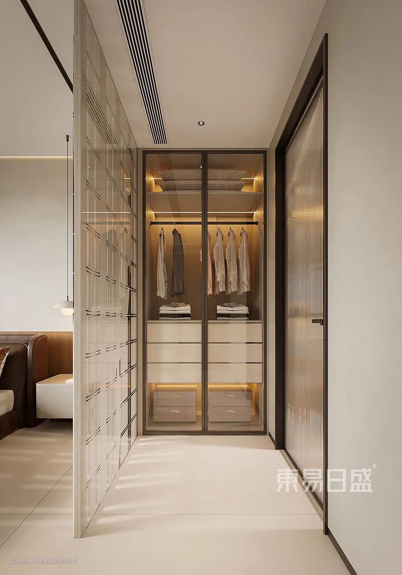 在主卧中也配备了一个小型的衣帽间,透明的玻璃柜门更显品质和高级感,雕花的屏风透光不透影,保证了衣帽间的采光问题,还满足隐私。