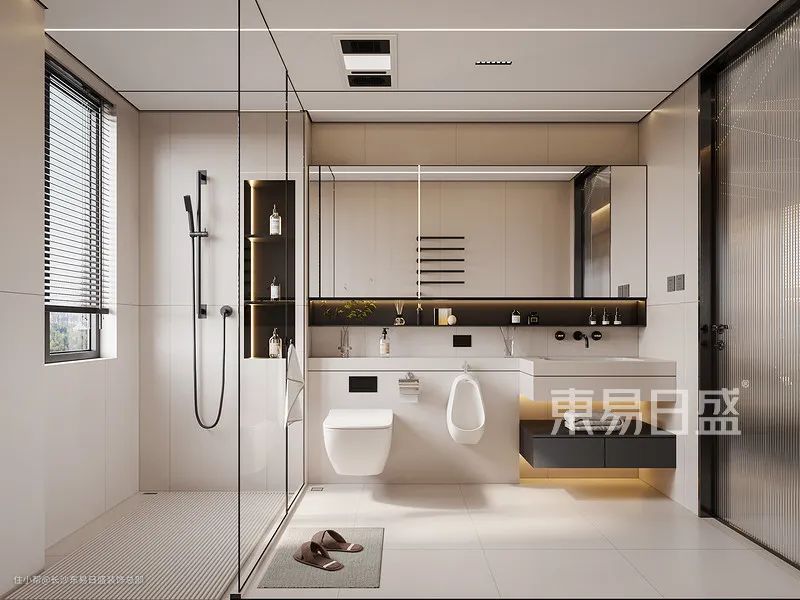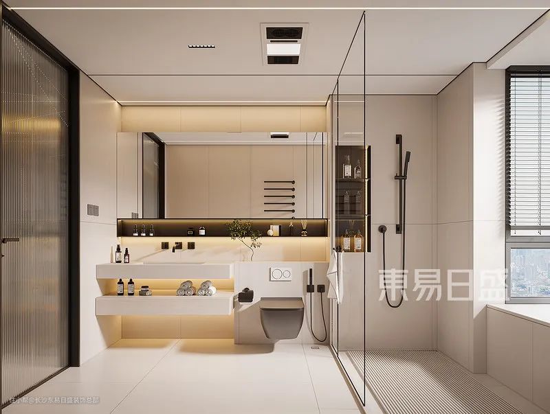 主卫的设计则是位于主卧里面,时尚前卫,科技感满满,与客卫的设计有异曲同工之妙,两个卫生间都装了收纳性洗手池,不仅颜值高还可以放置很多洗护用品,非常便捷。