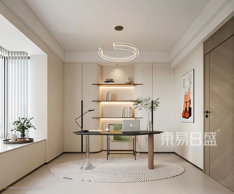 书房设计轻盈雅致,简约家具与配色营造温馨氛围。半开放式收纳区域与置物架结合墙体,打破传统书柜设计,灯带点缀增添活力。整体效果温文尔雅,舒适宜人,为阅读与思考提供理想空间。