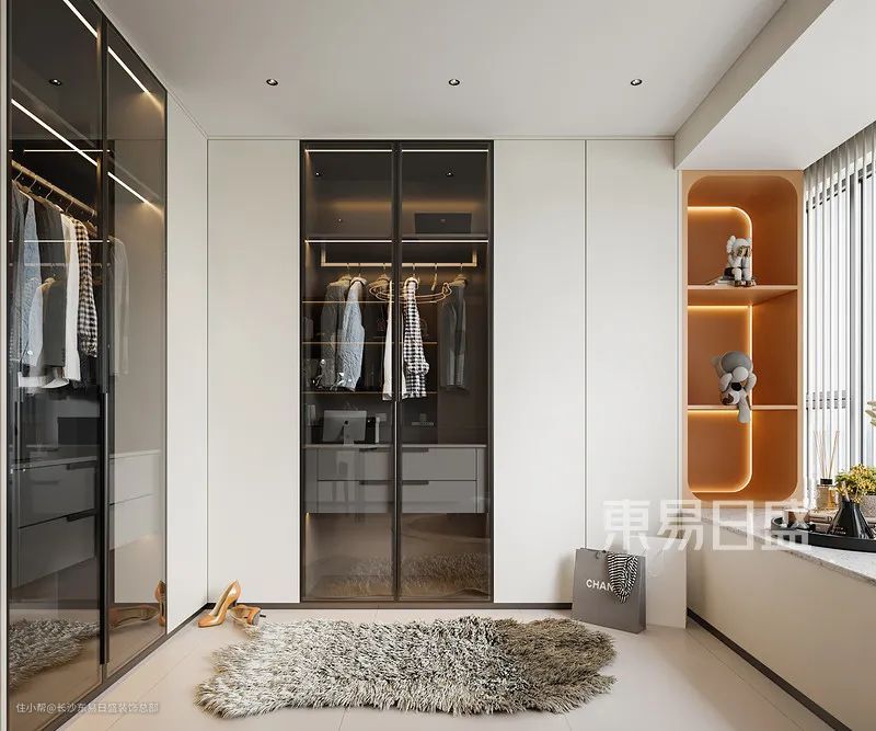 衣帽间的设计元素以简洁、时尚、实用为首要选择,按照业主需要进行分区;精致的选材,高级的色彩搭配,便是一个时尚新潮的衣帽间。
