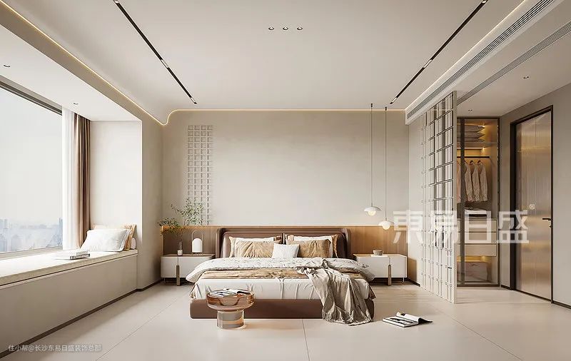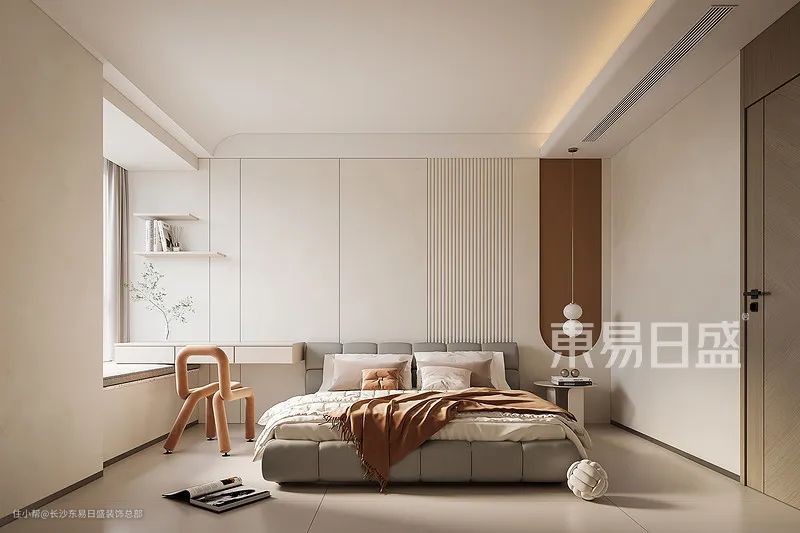 主卧设计时尚简约,奶油风配色带来温馨氛围。软包飘窗增添舒适感,靠坐休息享受惬意时光。无主灯设计与弧形天花板,提升空间高级感,打造品质睡眠环境。