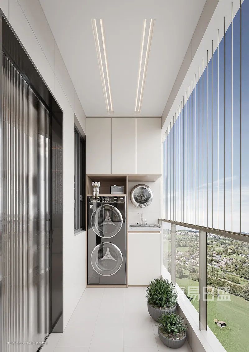 阳台设计融合生活与休闲,洗烘一体与通顶收纳实用又美观,全景落地窗让休闲时光更加惬意,欣赏美景,享受生活。
