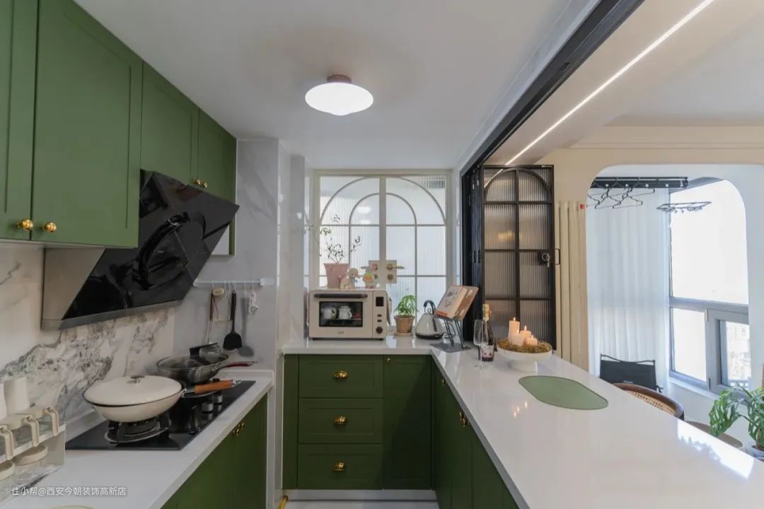 复古铁艺玻璃门窗营造出浓重的法式氛围感,橱柜使用绿色与白色进行撞色设计,既清新又浪漫。