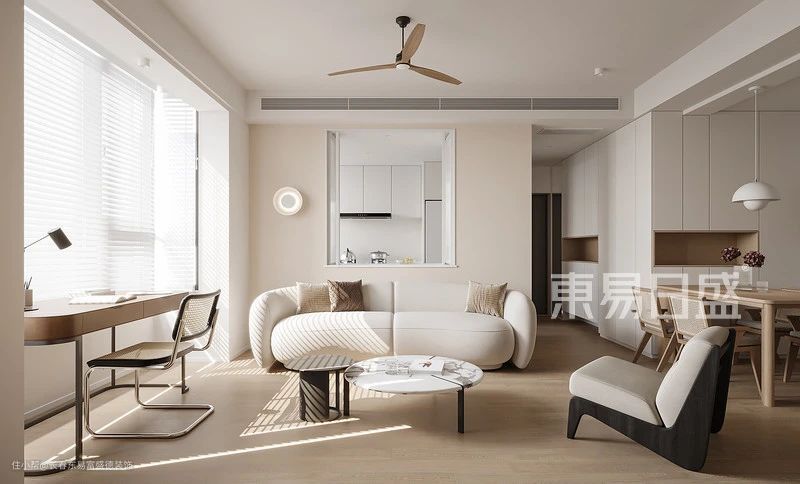厨房开放式设计,与客餐厅形成一个通透的公区,能增加采光性能,同时也可以形成良好的空间互动氛围。