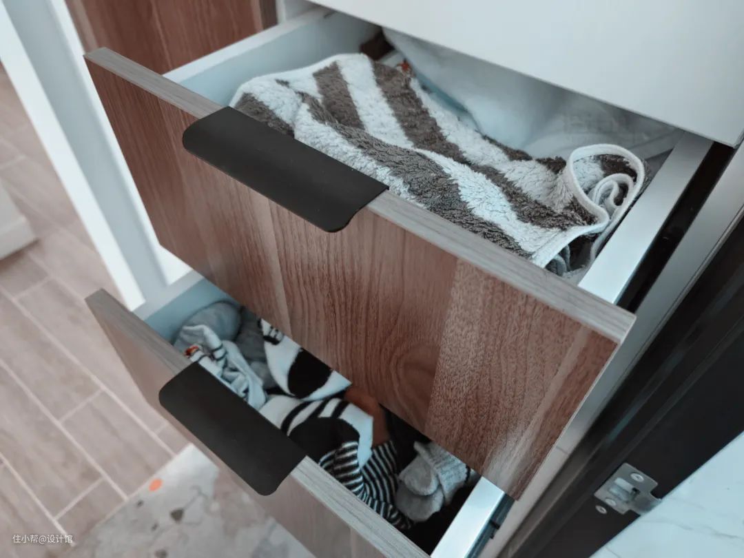 衣柜的抽屉,建议根据使用人数装2个或4个,每个人占据2个抽屉,每个人的内衣裤与袜子都可以分开收纳,既方便找,又有隔离效果(避免脚气传给内裤)。