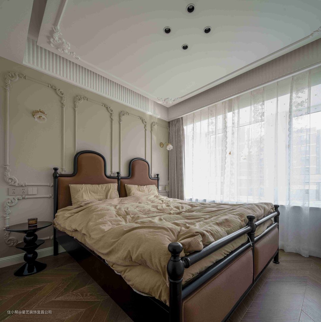 🧡主卧精美雕花吊顶+石膏线条墙面+鱼骨拼接地板,让简洁的空间也拥有轻奢的感觉。一整墙的收纳柜,满足业主日常收纳需求。