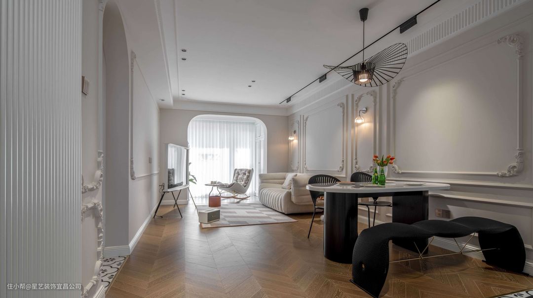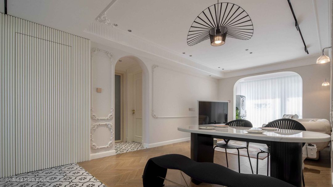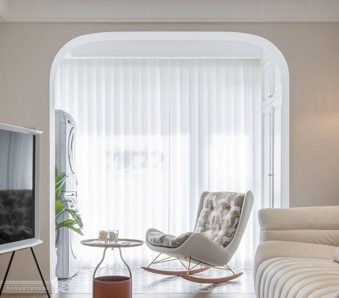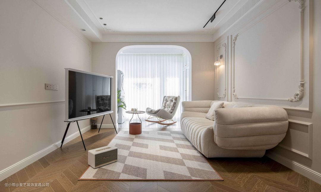 🧡业主不想安装电视柜我们就想到了线条感强的移动式电视架,节省空间,也比较省钱,还很好看,完美解决了大家客厅要不要放电视的问题。客厅到阳台我们选用双拱形门的设计,使整个客厅线条看起来更加柔和。